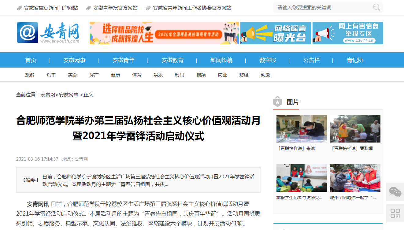 近日,安青网、安徽教育网对我校举行第三届弘扬社会主义核心价值观活动月暨2021年学雷锋活动启动仪式进行了报道。(校团委)