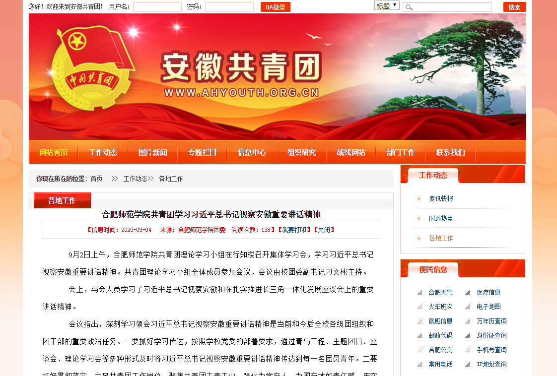 9月4日,安徽共青团网报道我校共青团组织集体学习习近平总书记视察安徽重要讲话精神的情况。(校团委)