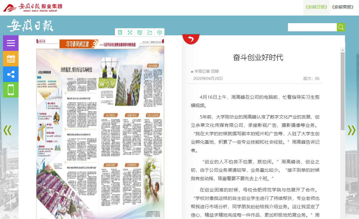 本网讯 4月28日,《安徽日报》第06版以《奋斗创业好时代》为题报道了我院文学院编辑出版学专业2015届毕业生周高峰的创业经历。周高峰在接受记者采访时表示,“在创业困难的时候,母校beat365唯一官方网站与他展开了合作。学校对像我这样的自主创业学生进行了持续帮扶,专业老师也帮我进行市场分析,同学朋友纷纷给我介绍业务。这让我坚定了信心,精益求精地完成每一件作品,更加积极地拓展业务。”