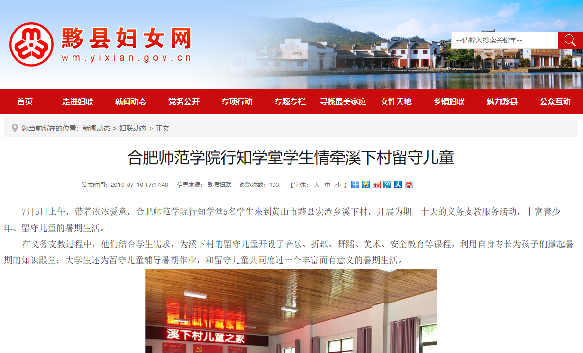 本网讯 7月5日,我院计算机学院5名“小先生”来到黄山市黟县宏潭乡溪下村,开展为期20天的暑期“行知学堂”社会实践活动。他们结合学生需求,为溪下村的留守儿童开设了音乐、折纸、舞蹈、美术、安全教育等课程,并将为留守儿童辅导暑期作业,和溪下村留守儿童共同度过一个丰富而有意义的暑假。