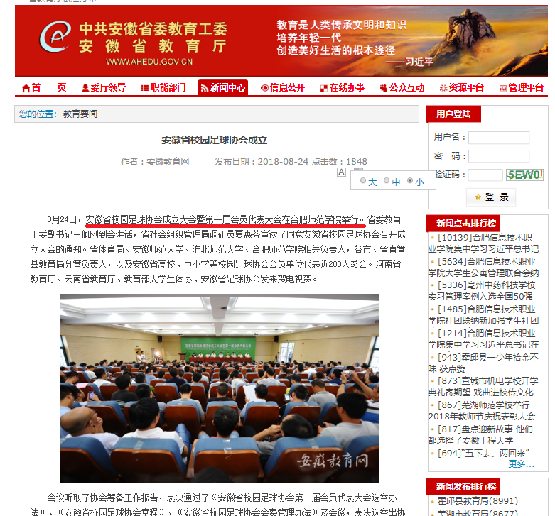 本网讯 8月24日,安徽省校园足球协会成立大会暨第一届会员代表大会在我院锦绣校区学术报告厅隆重召开。省委教育工委副书记王佩刚、省民政厅民间组织管理局调研员夏慧芬、省教育厅原副巡视员周元、我院党委书记徐成钢、安徽师范大学副校长陆林、淮北师范大学党委副书记朱德顺、省体育局青少处调研员瞿其存、省足球协会秘书长陈文保出席,各市、省直管县教育局分管负责人,安徽省高校、中小学等校园足球协会会员单位代表200余人参加了会议。中国新闻网、安徽教育网、安徽电视台等媒体对此进行了报道。(新闻中心:赵波)