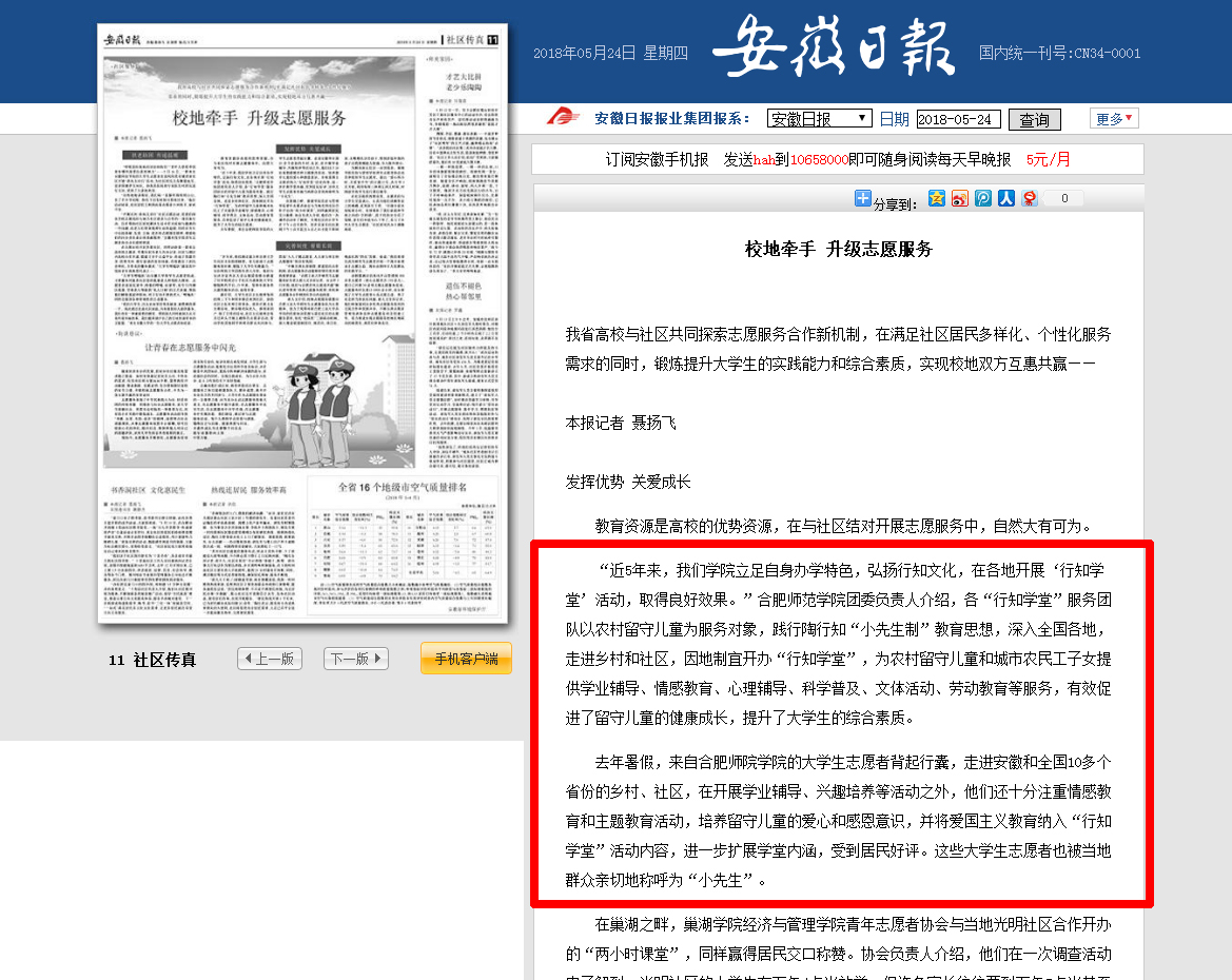 本网讯 安徽日报5月24日在第11版“社区传真”中对我校与社区共同探索志愿服务合作新机制,开展“行知学堂”实践活动情况进行了报道。(新闻中心:木杉)