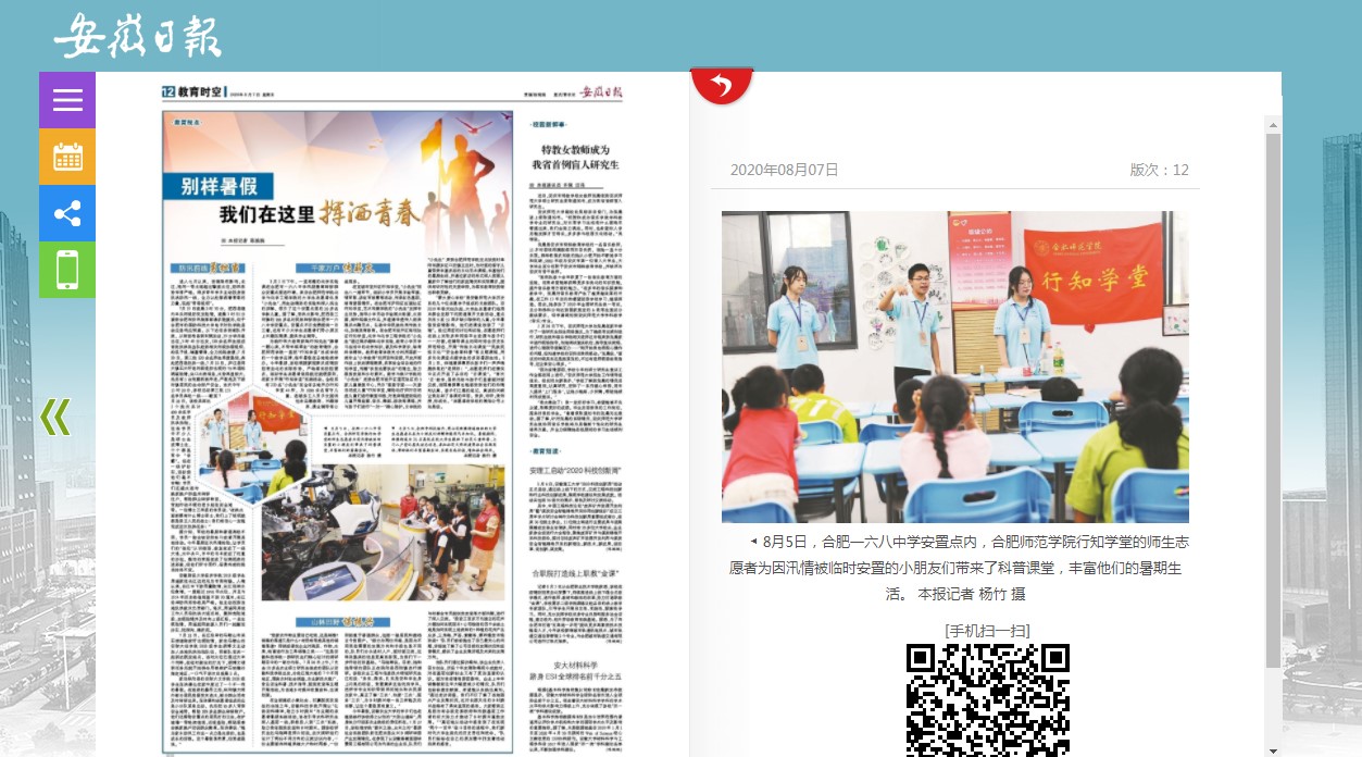 艺术传媒学院与庐阳区德泰和健康心理公益文化发展中心联合打造中华公益小记者红旗社区行知学堂,依托专业特色和资源优势开设创意手工、创新绘画等课程,丰富了城市农民工子女的假期生活。经济与管理学院海恒社区行知学堂围绕传承中华传统文化,因地制宜的开展讲故事、进基地、谈心得等国学教育活动。音乐学院在合肥市笔架山街道天鹅湖社区服务中心开办行知学堂,通过提供音乐教育、情感教育和素质拓展课程,提升儿童的音乐素养和艺术审美。物理与材料工程学院长夏乐学行知学堂以爱国主义教育为办学主题,开设思想引领、行知文化、红色课堂等特色课程,为孩子们带来丰盛的红色盛宴。数学与统计学院与思语自闭症儿童康复中心、梦之桥自闭症儿童康复中心、晓燕子自闭症儿童康复中心合作共建3所特殊行知学堂,为城市自闭症儿童提供人际关系训练、游戏与介入、感觉统合训练、绘画、音乐、舞蹈、游戏等课程,与孩子们建立“一对一”精心陪护。
